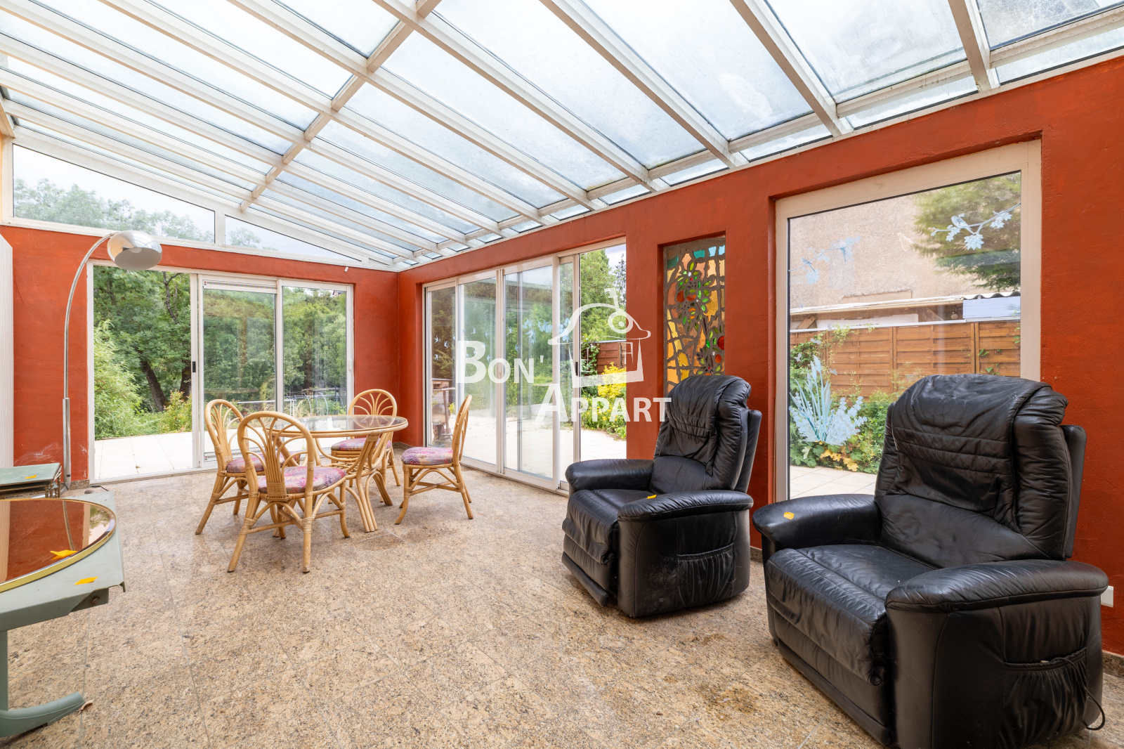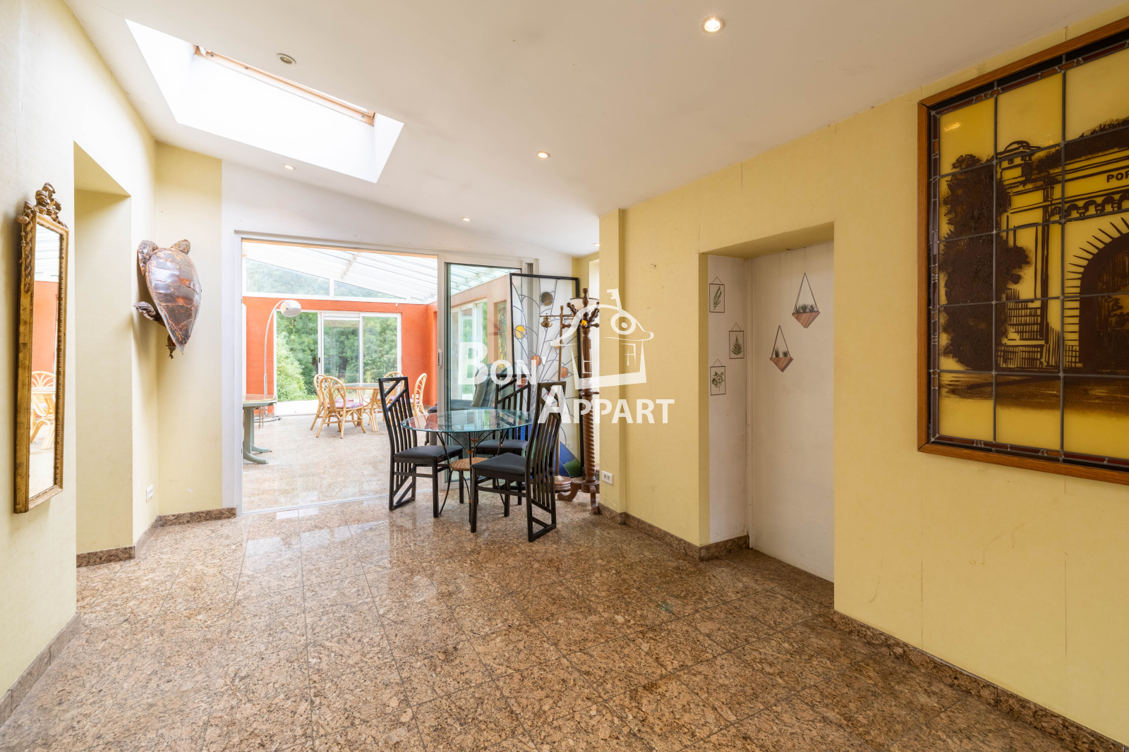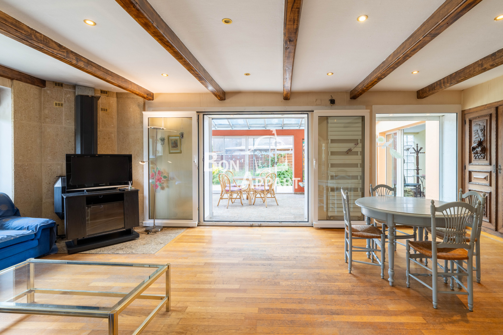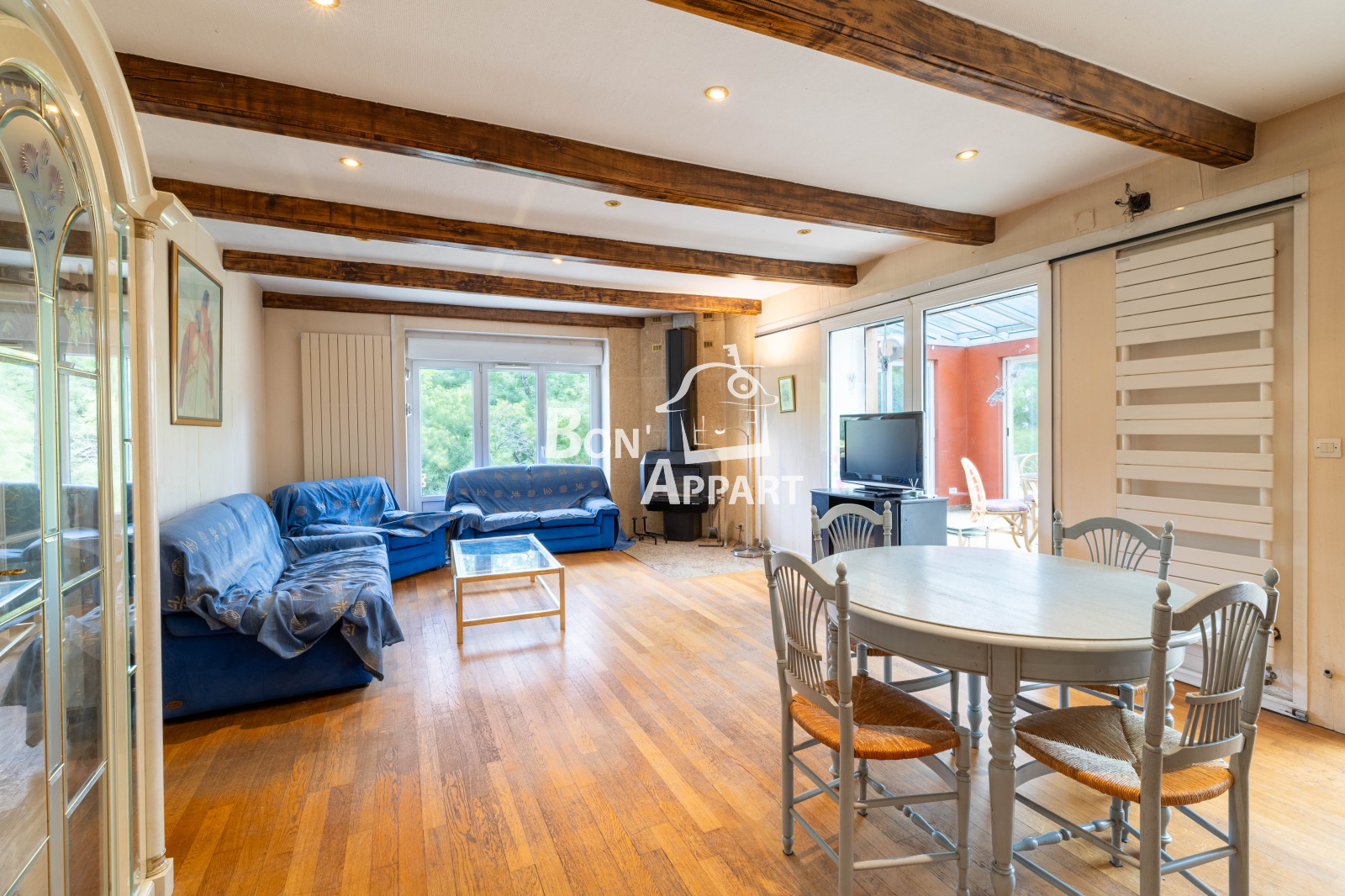 Grand hall d'entrée, belle véranda donnant sur les extérieurs, belle pièce de vie avec poéle a bois, vous allez pouvoir profiter pleinement de ses grands espaces.